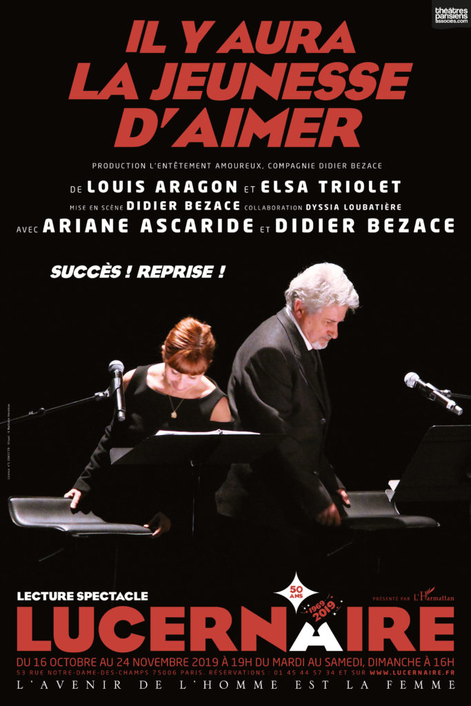 D’autres textes, moins connus du grand public, tel le sublime roman Aurélien sont également mis à l’honneur pendant cette lecture-spectacle. L’extrait sur la confrontation de deux univers sociaux à la piscine est criant de vérité. Tandis que quelques pages d’un autre ouvrage, qui évoquent un interrogatoire surréaliste et glaçant par la Gestapo, nous font frissonner tant Ariane Ascaride et Didier Bezace les interprètent avec conviction. La mise en scène est sobre, lumières tamisées, hauts tabourets, lutrins, comédiens côte à côte, lisant à peine leurs feuilles tant les textes les habitent. Ariane Ascaride et Didier Bezace se répondent, et les mots des deux amoureux se transforment alors en écho. Chamailleries, complicités de toutes sortes, les textes lus ici mettent en lumière des aspects peu connus des deux auteurs, qui ont vécu de nombreuses années ensemble. Lorsque la mort les sépare, Aragon est effondré, tant leur union fut forte.