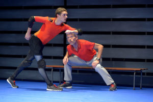 Un gymnase quasi-vide, seulement deux bancs et des bandes de ruban adhésif de diverses couleurs collées au sol. Coach ultra-investi, Jacques Gamblin, prépare méticuleusement sa séance. D’emblée, on le sent perfectionniste limite maniaque, caricatural, on commence à sourire. Arrive Bastien Lefèvre, son élève, sur-motivé. Là aussi, l’exagération des traits de caractère est plaisante.