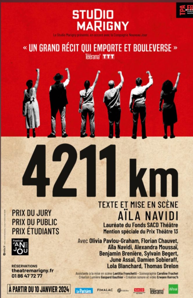 Comment combattre l’horreur ? En la dénonçant avec intelligence. Parfaitement incarnés par des comédiens investis, les personnages ont quelque chose d’épique et le discours devient universel. Aïli Navidi rappelle que rien n’est fini. Les combats contre la barbarie ne peuvent cesser. En Iran, des gens meurent encore tous les jours. Nous sommes à 4211 km de Téhéran mais sur une scène de théâtre, on sent si proches de ces fugitifs et leurs proches.