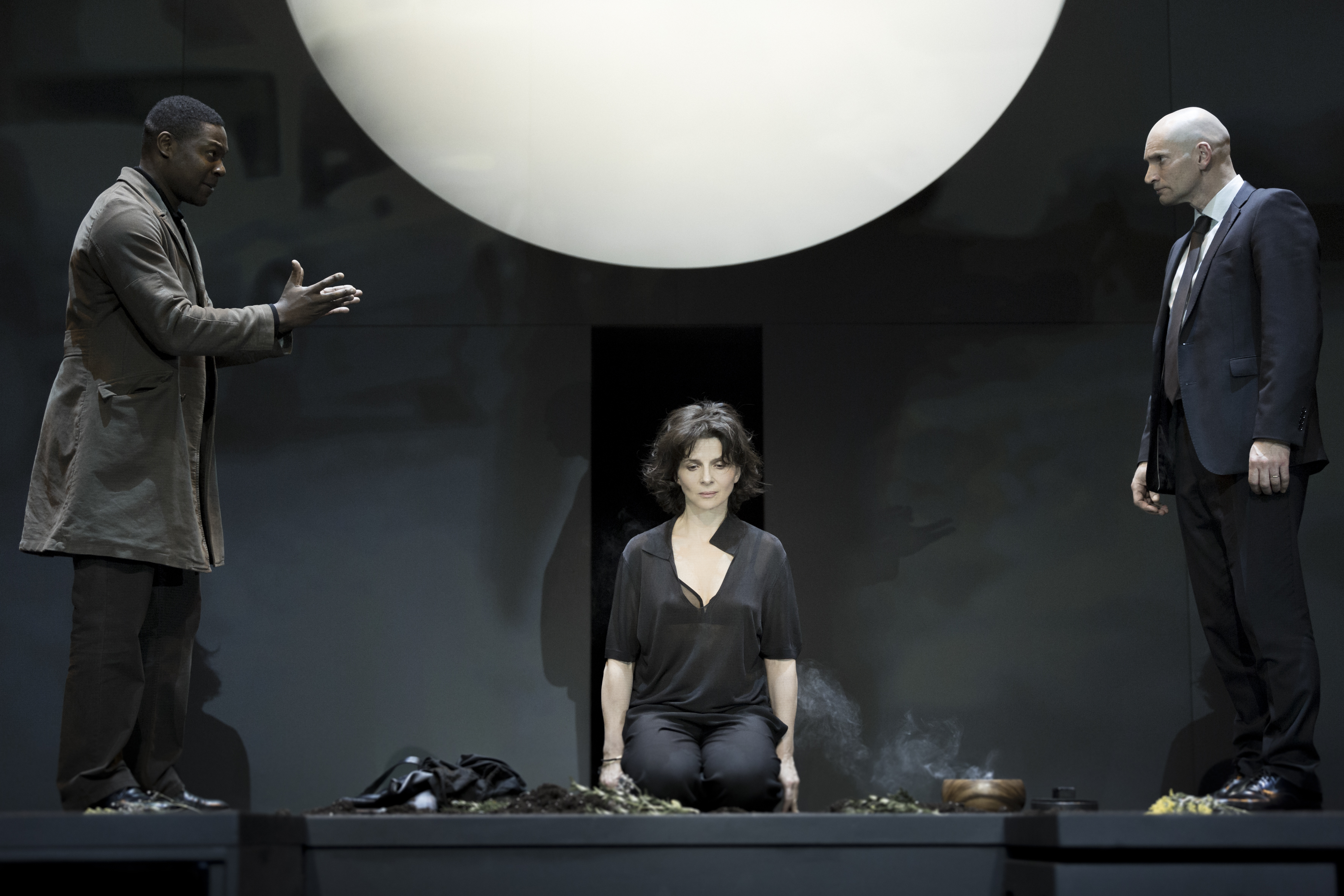 Et d’une parce que Juliette Binoche ne convainc pas. Elle crie, affiche une tête sombre, ne parvient pas à transmettre l’innocence et la fougue d’Antigone. Et de deux car la tragédie grecque se marie mal avec le moderne en l’absence de finesse. La transposition est maladroite, sans émotion et lente. Les comédiens se tombent dans les bras, se caressent frôlant le sentimentalisme déplacé. Et enfin car à trop vouloir mêler les codes actuels au théâtre antique, on fait perdre de sa force au tragique.
