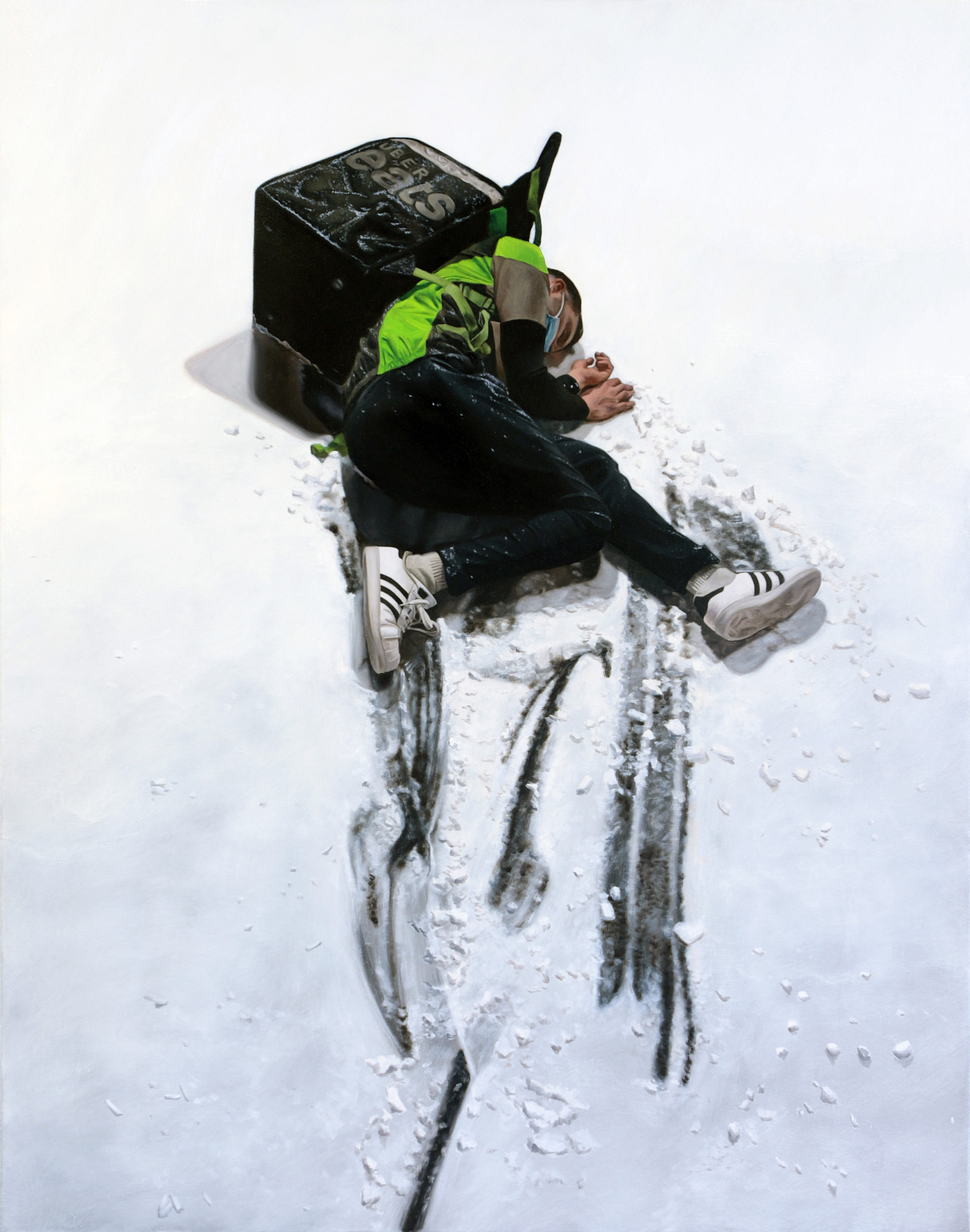 Pourtant, Arnaud Adami est bel et bien moderne. Sa peinture est en prise directe avec le réel de notre époque. Les thèmes abordés sont résolument modernes. L’artiste portraiture les forçats de notre Société : les livreurs, les soignants, les ouvriers d’abattoirs, ces premiers de corvée qu’on a oubliés à peine passée la crise Covid. Il les peint avec précision et respect. Avec lui, vous ne serez pas étonné qu’un livreur se transforme en prince.