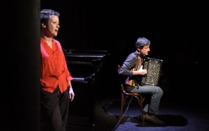 Devant un rideau rouge satiné prennent place les musiciens. Accompagnés de leur accordéon, contrebasse, guitare, piano, violoncelle ils plantent le décor cabaret. Entre notes légères et graves, le répertoire de Léo Ferré est mis à l’honneur.