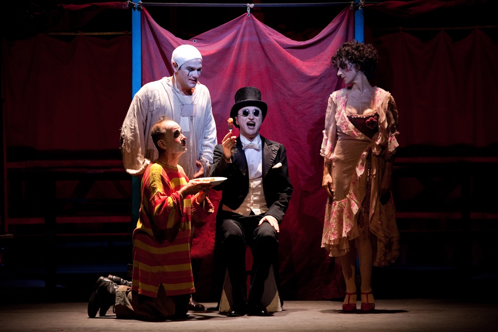 Raffaele Viviani est un caricaturiste, chanteur, acteur et auteur napolitain. Il a décrit avec respect et humilité le milieu des petites gens. Ici, il évoque la vie précaire d’une troupe de cirque et semble parler d’expérience. Le spectacle se passe dans les coulisses et s’intéresse à la vie de gens simples, à la recherche du bonheur. Précarité, solidarité, persévérance du désespoir (le spectacle doit continuer malgré la faim, la peur de l’abandon ou de la chute) sont illustrés ici. Dans le premier acte, le drame couve. Tous répètent, mangent ou se détendent: l’acrobate trompe sa femme (la dévouée Zenobia) avec la fille du patron, tandis que la femme du clown triste (le pauvre Samuele) organise sa fuite avec le dresseur de chevaux. Dans le second acte, le drame est consommé: Samuele et Zenobia (tous deux abandonnés) se retrouvent par hasard et se racontent le temps passé depuis la fin du cirque Sgueglia.