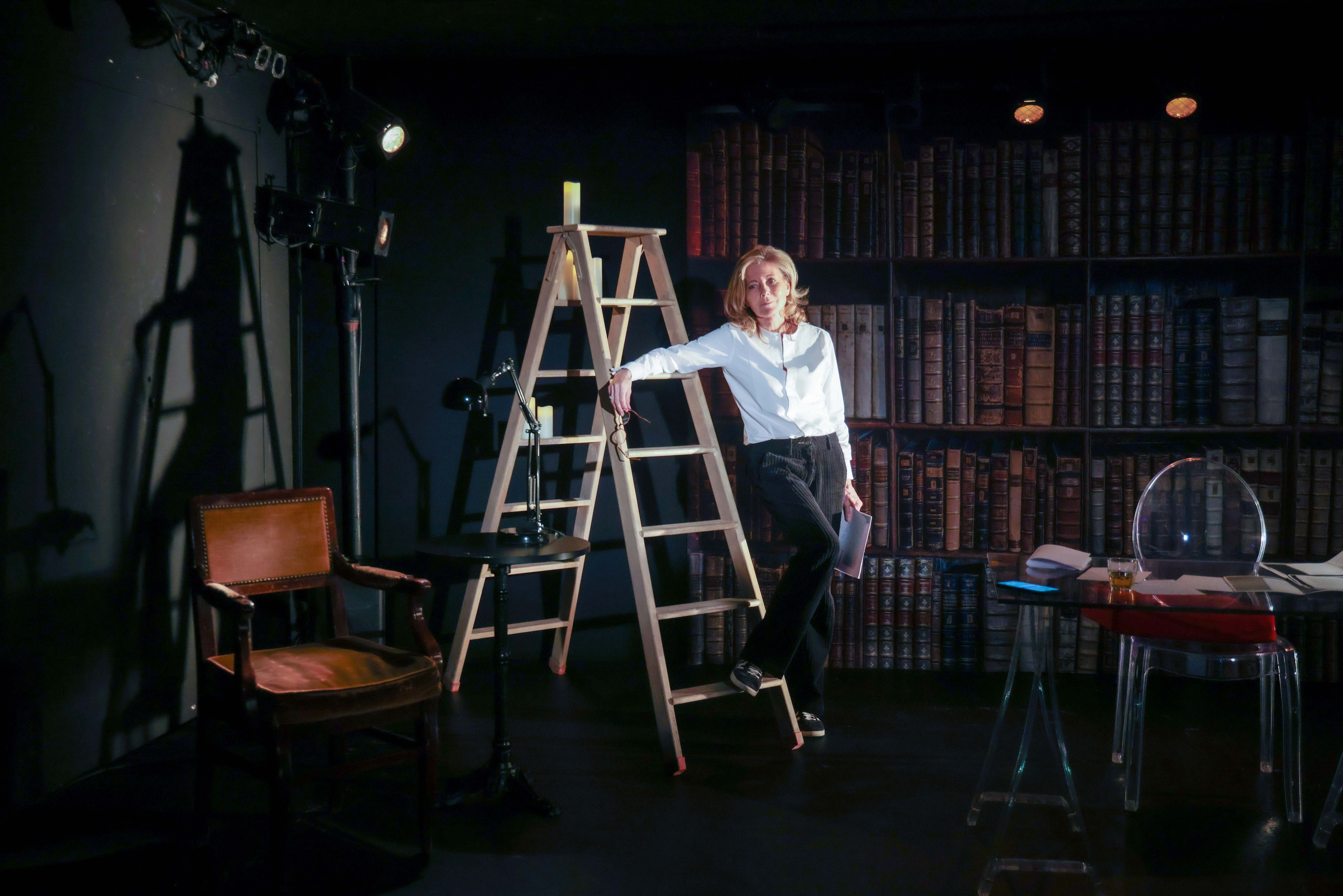 Juste avant le spectacle, j’étais un peu perplexe : comment la « dame du petit écran » serait-elle en lectrice ? Élégante, dans un magnifique décor de bibliothèque, elle se déplace de l’échelle au bureau. Et je retrouve sa voix, son visage, le sourire en plus.