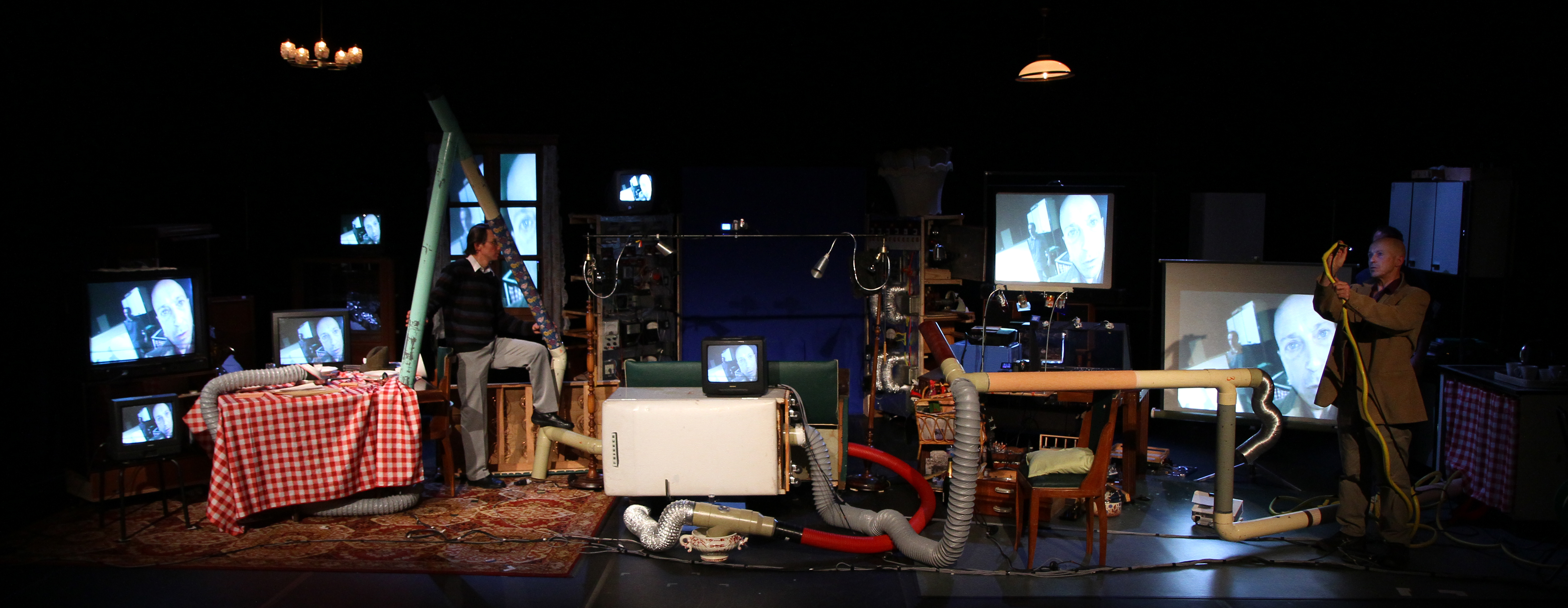 La particularité de ce spectacle est – notamment – qu’il donne à voir les films (supposés de Marcel Blondeau) en même temps que leur fabrication. Car Marc et ses deux cousins, qui ont sauvé de la destruction ce fragile et désuet chef d’œuvre, nous offrent ce privilège: on voit les films de Marcel projeté sur des écrans (vieilles télé, fenêtres) en même temps qu’ils rejouent pour nous, en objets et en miniature, les scènes principales de sa vie. Sa vie et la fin qu’il s’est imaginée, c’est-à-dire sa vie réelle et sa vie rêvée.
