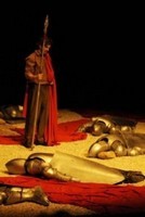Derrière les danseurs, un sol bleu-vert qu’ils dévoileront petit à petit. Les tissus qu’ils enlèvent déploient ainsi le sens de leur récitation, ce sera le seul contre-point visuel au texte déclamé : de l’or, puis du rouge – l’héroïsme, puis la boucherie. Par moments se surimposeront aux vers de l’Iliade des passages d’autres auteurs en italien, portugais, espagnol, anglais et allemand et s’érigera ici une confrontation sensible entre l’épopée classique et la narration personnelle plus contemporaine.
