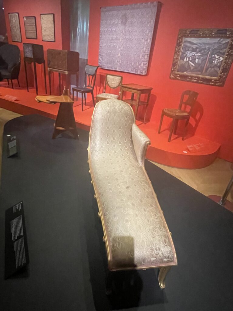Dans la salle 4, qui revient sur les prémices du nouveau style, les tissus et les meubles du décorateur Paul Follot témoignent d’une curieuse transition entre Art nouveau et Art déco. Sa chaise-longue de 1912, notamment, rappelle encore par sa forme et ses dorures les styles historiques, ses lignes sinueuses sont héritées de l’Art nouveau, mais la sobriété de son décor et sa structuration par des motifs de roses stylisées appliqués le long de la ceinture et du dossier la font déjà entrer dans l’Art déco.