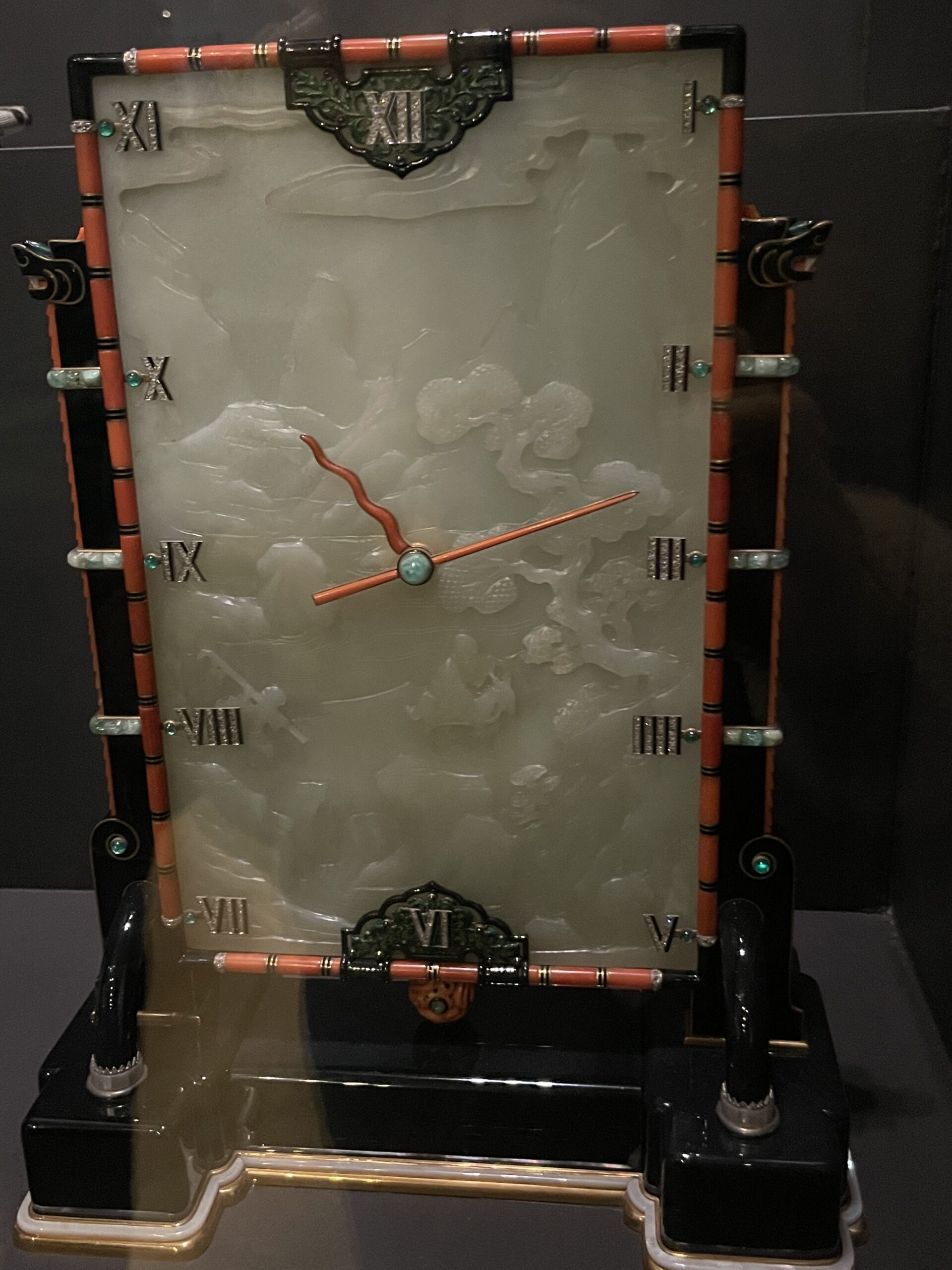 Une salle entière (la salle 2) est dédiée au joailler Cartier, qui exposa quelque 150 pièces en 1925 et fit figure de pionnier pour sa géométrisation des formes et son inspiration orientale. Ses créations sont aussi visibles dans d’autres salles, comme cette somptueuse pendule de 1927, composée à partir d’un écran chinois en jade blanc sculpté du XVIIIe siècle (écran qui devait orner le bureau d’un lettré), dont les montants en onyx figurent deux têtes de dragons stylisés.