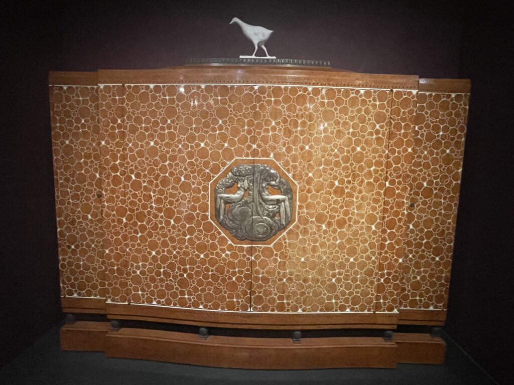 L’ébéniste Jacques-Émile Ruhlmann, surnommé « le Riesener de l’Art déco » (en référence à l’ébéniste de Louis XVI) pour sa maîtrise des essences rares associées à d’autres matériaux précieux et la clientèle prestigieuse de son entreprise, apparaît comme le modèle de l’ensemblier, qui conçoit l’ensemble de ses intérieurs, décors, mobilier et objets d’art compris. Le pavillon, dit « du Collectionneur » qu’il fait construire par Pierre Patout sur l’esplanade des Invalides en 1925, véritable manifeste de l’Art déco français, réunissait les œuvres de près de quarante artistes et artisans (Brandt, Puiforçat, Décorchemont…). Plusieurs de ses créations emblématiques sont visibles ici, tel le bahut Élysée, exposé au Salon d’automne de 1920 puis à l’exposition de 1925 avant d’être livré à l’Élysée. Sa façade ornée d’une marqueterie en loupe d’amboine vernie et ivoire reproduit un motif de cailloutis élaboré par la manufacture de porcelaine de Sèvres dans les années 1760.