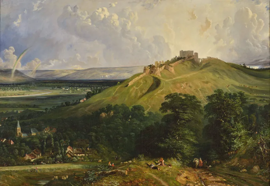 Plusieurs très grandes toiles représentant des vues panoramiques d’Avignon, de Rouen ou de Dieppe sont exposées dans cette section. La Vue du château d’Arques, près de Dieppe (115 x 187 cm) est la réduction d’une composition de treize mètres de long peinte en 1829 pour le Diorama Montesquieu – ensemble de quatre toiles animées par des jeux de lumière –, aujourd’hui disparue. La composition foisonnante est construite à la fois en plongée et de face et ses multiples plans successifs donnent une impression de profondeur presque vertigineuse. La lumière changeante du ciel normand baigne ce vaste horizon.