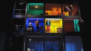 Comment est-ce d’assister à une pièce en russe sur les planches d’un théâtre de Saint-Denis? Une expérience aussi géniale qu’inédite. Observer jouer des comédiens russes, dans leur langue, après avoir rapidement lu les surtitres français (qui sont projetés au-dessus et des deux côtés de la scène) s’avère fascinant et on est surpris de découvrir une technique de jeu d’une expressivité folle, incroyablement actuelle et complice avec les spectateurs, et de ressentir une proximité immense avec des personnages parlant pourtant une langue étrangère. Non seulement la barrière de la langue est gommée, oubliée, mais tout ce qu’il y a d’universel dans le théâtre à commencer par le jeu non-verbal, est magnifiquement travaillé et s’avère tout à fait jouissif (Yulia Marchenko excelle dans le genre). Comme dans tous ses spectacles, Jean Bellorini se montre d’une délicatesse folle. Exigeant du beau à tous les niveaux, il ne néglige pas non plus les lumières ni la musique – italienne pour la plupart – et ces dernières viennent subtilement ajouter les touches de légèreté et de rêverie nécessaires. Comment sombrer dans le désespoir devant autant de dérision et d’énergie et alors que résonnent déjà les premiers accords de Volaaaaare Cantaaaaare oh oh oh oh ? Au contraire, on s’envolerait presque de ce microcosme russe vers ce Capri rêvé. Quelle soit écoutée dans l’intimité du tourne disque du couple de vieux du troisième étage (Maria Kuznetsova et Vladimir Lisetkii sont splendides), jouée en piano live par Michalis Boliakis ou chantée en chœur par les comédiens face au public, la musique fait voler en éclats la pesanteur de nos vies et injecte la dose parfaite de beau et d’émotion en pleine confusion des sentiments.