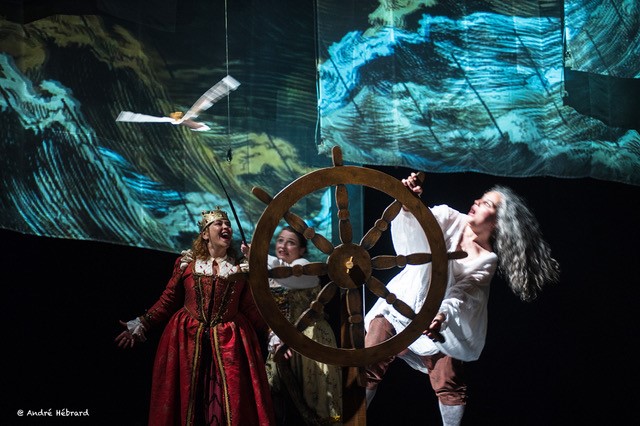 Face scène, le spectacle s’ouvre sur les déclamations de l’un des acteurs en vieux français. Le ton se veut tragique et engagé. Pris au dépourvu, le public oscille entre étonnement et rires…