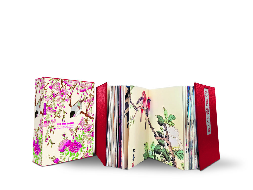 Dans un écrin de tissu rouge vif s’ouvre devant nos yeux éblouis une envolée d’oiseaux, œuvres des plus grands maîtres de l’estampe japonaise.