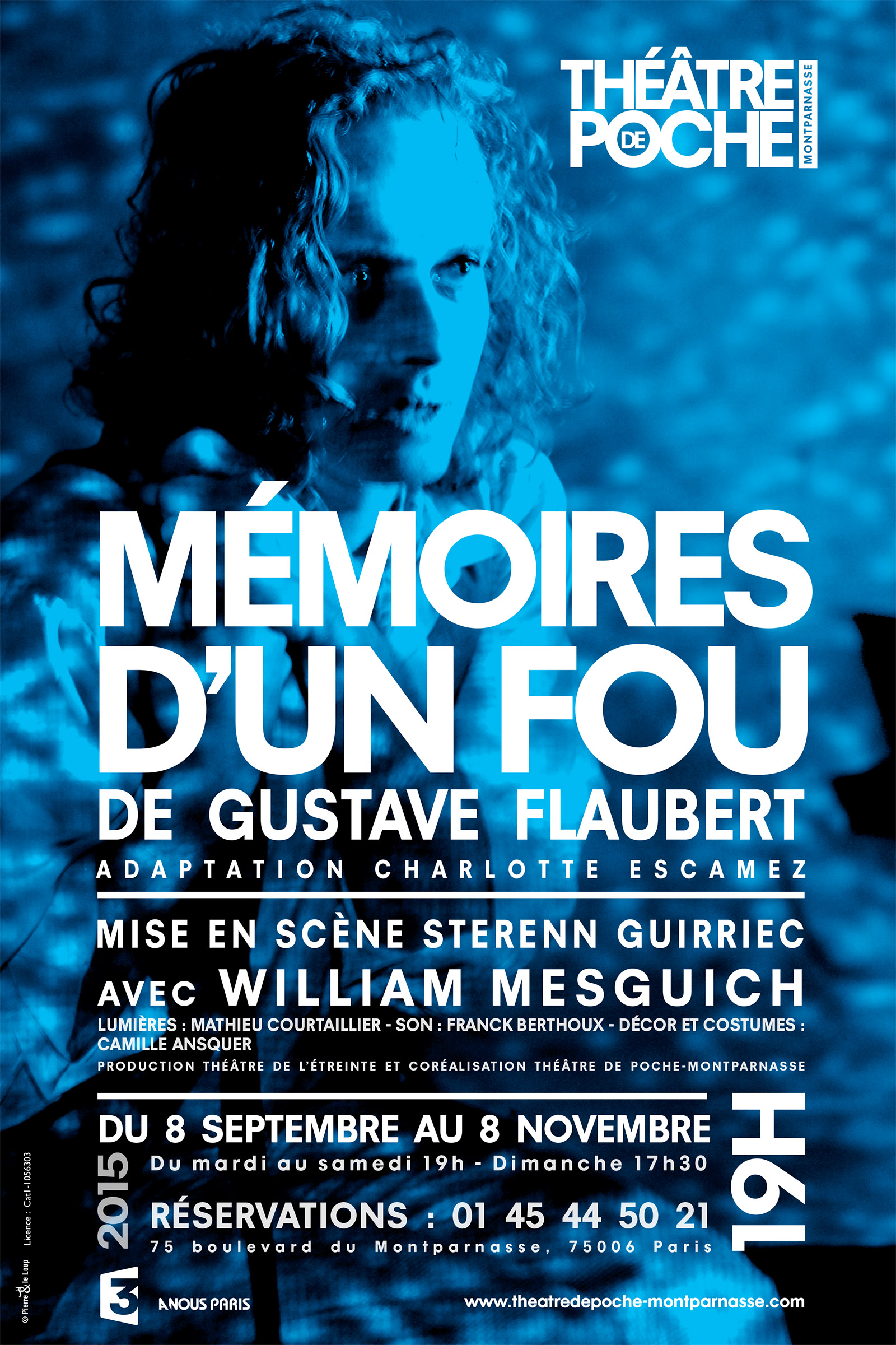 Seul en scène dans la salle du bas du Théâtre de Poche, William Mesguich livre une interprétation très physique des Mémoires d’un Fou de Gustave Flaubert. En nage, encerclé de feuilles de papier (qu’on devine être des ébauches de son Dictionnaire des Idées Reçues) dont il se saisit frénétiquement, William Mesguich est un Flaubert exalté, presque possédé.