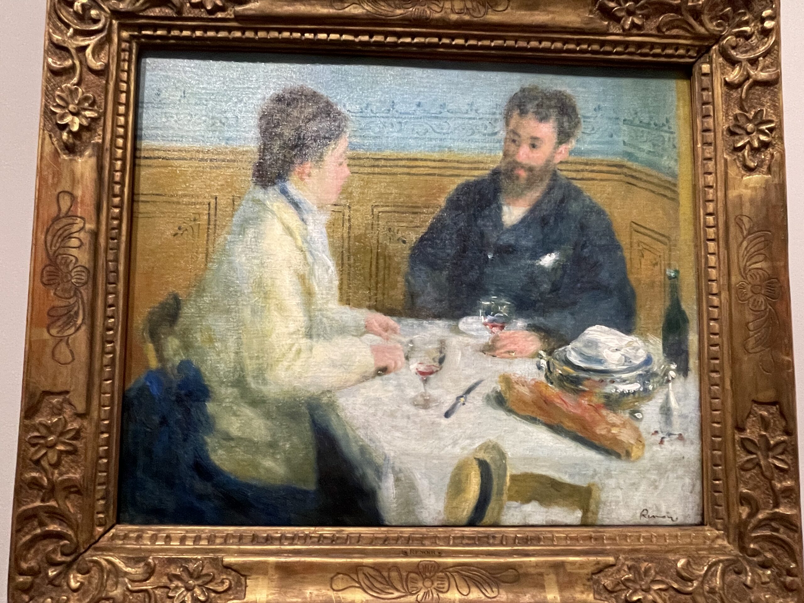 Quarante ans après la rétrospective de 1985 au grand Palais, cette exposition porte un regard nouveau sur la peinture de Renoir, « peintre du bonheur », certes, mais ni mièvre, ni sentimental, à l’image de cette scène de déjeuner toute simple (Le Déjeuner, 1875) : un homme et une femme partageant un repas frugal dans un coin de salle, saisis au moment où, cessant de parler, l’homme regarde sa compagne pensivement.