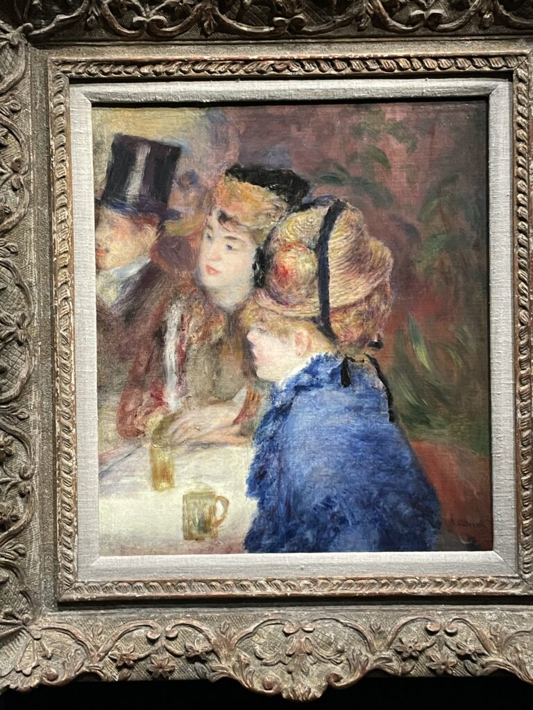À Paris, où il vit, Renoir s’intéresse aux rencontres et échanges dans les lieux de sociabilité que sont les cafés et les théâtres. Contrairement à ceux de Manet ou Degas, les personnages qu’il figure ne sont jamais seuls, mais toujours liés à leurs semblables par un regard ou le fil d’une conversation. Dans l’une de ses petites toiles intitulées Au Café (1877), au cadrage serré et légèrement décentré, à la manière de Degas, il place côte à côte, formant une diagonale courbe, un couple bourgeois et une jeune femme plus modeste, le regard dirigé vers le même interlocuteur invisible.