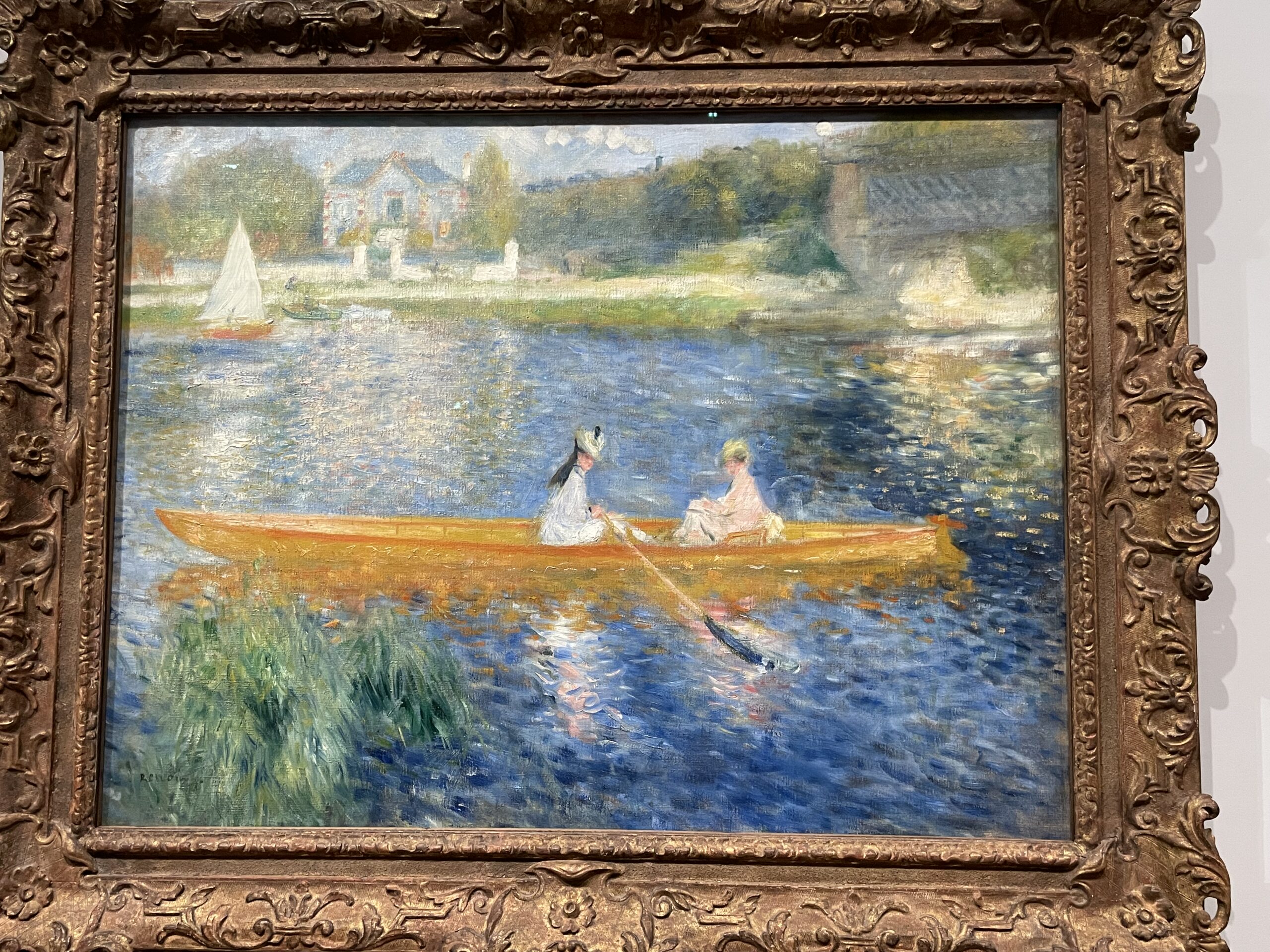 La Yole (1875), prêtée par la National Gallery de Londres, est une œuvre dont le motif comme le traitement sont typiquement impressionnistes : sur la Seine, sans doute près de Chatou, une yole (sorte de barque) évolue avec deux élégantes, l’une ramant, l’autre flânant, tandis que, derrière les frondaisons à l’arrière-plan, se devine la cheminée et le panache de fumée d’une locomotive qui approche d’un pont ferroviaire. Les touches de couleur pure juxtaposées pour rendre la surface de l’eau donnent l’impression d’une luminosité éblouissante, et l’insertion de l’orange vif de la yole dans le bleu saphir de la rivière fait scintiller ces deux couleurs complémentaires.