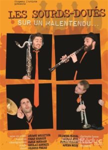 Quatre Surdoués cravatés jouent de la clarinette, de la trompette, du cor et de la clarinette basse sans oublier de jouer d’eux-mêmes. Avec assurance sur scène et une équipe de choc : du metteur en scène au magicien, de la chorégraphe au chef de chant, ils offrent un spectacle de jeu musical et théâtral où l’on ne s’ennuie pas un instant.